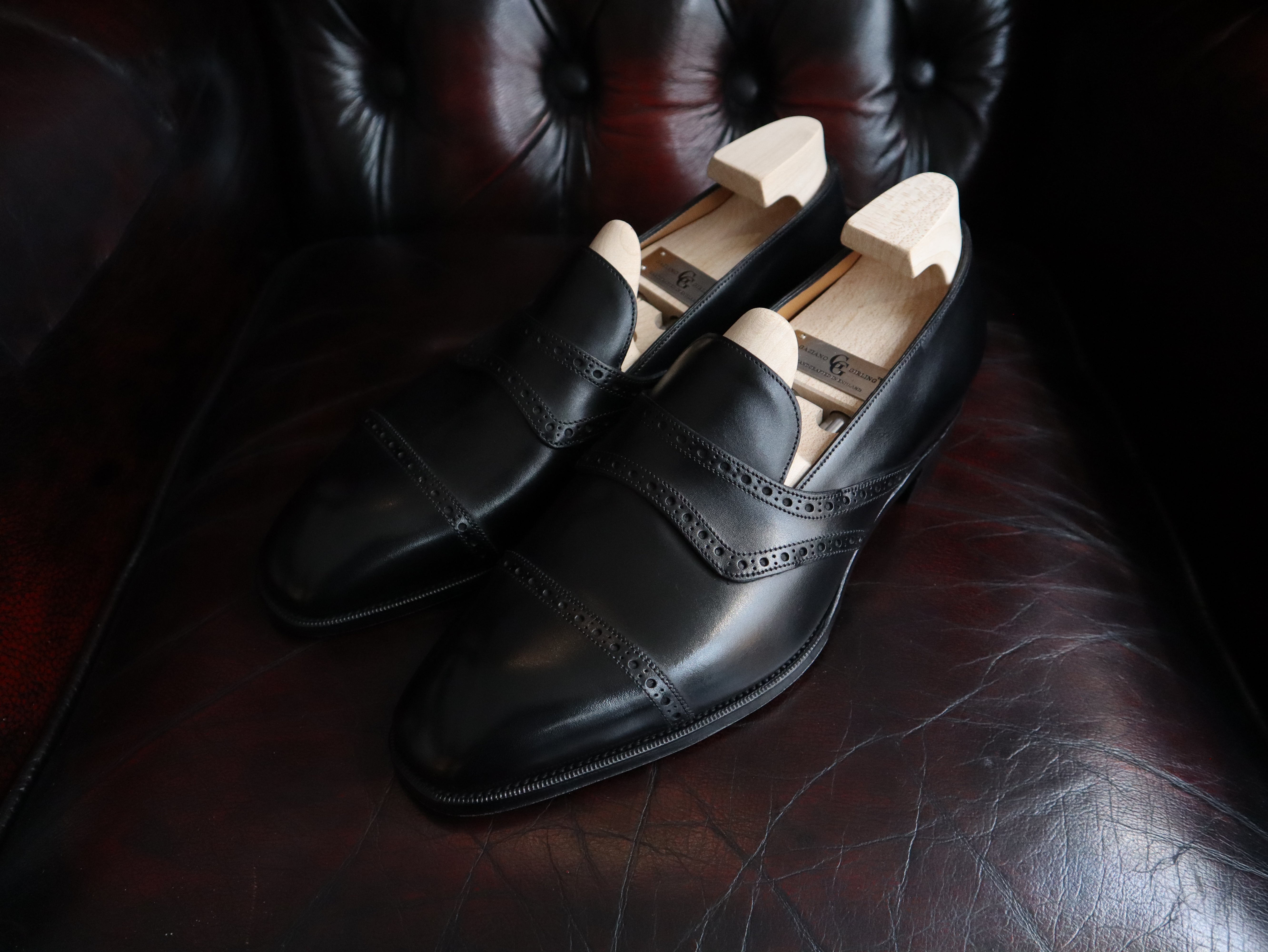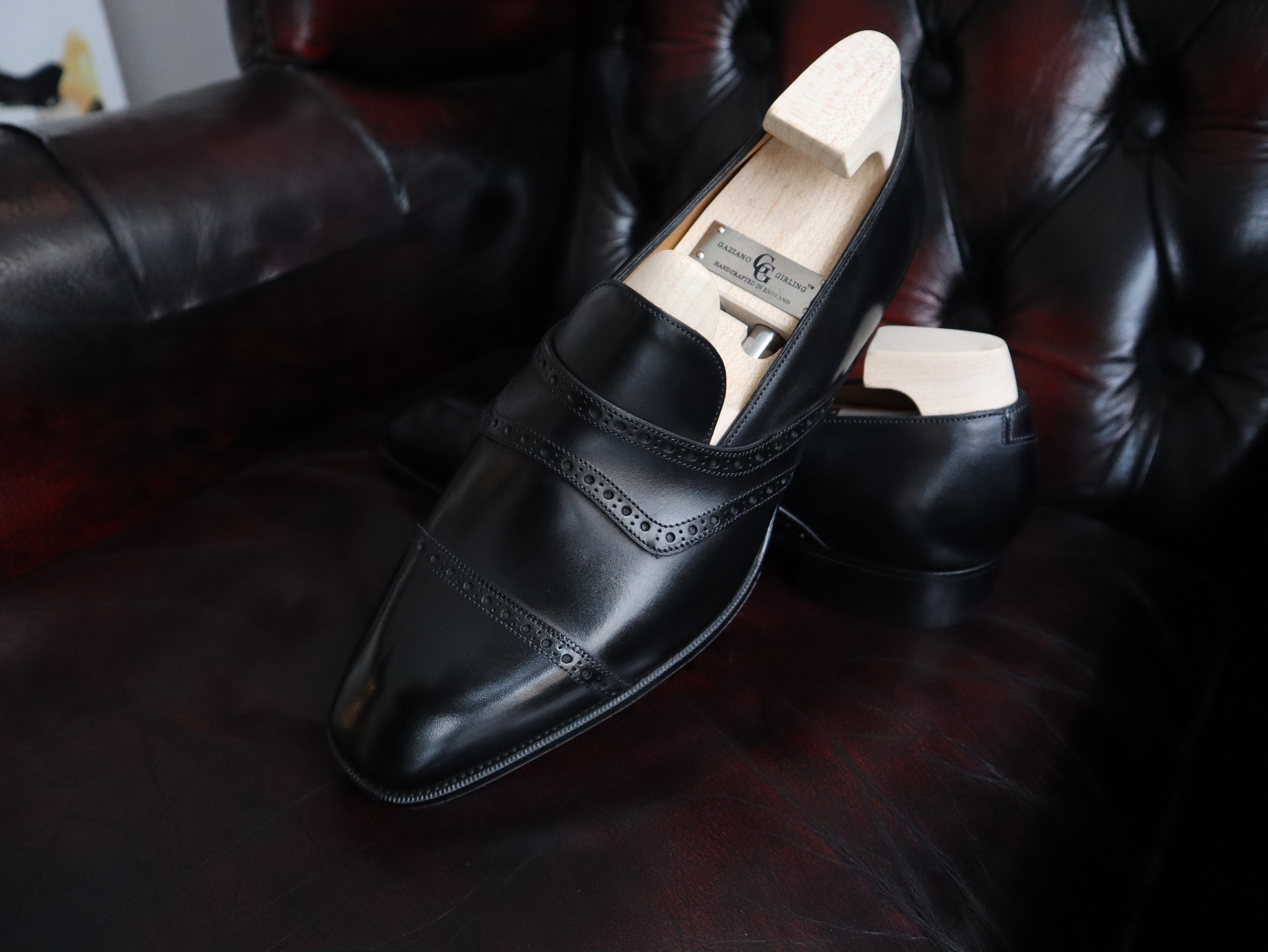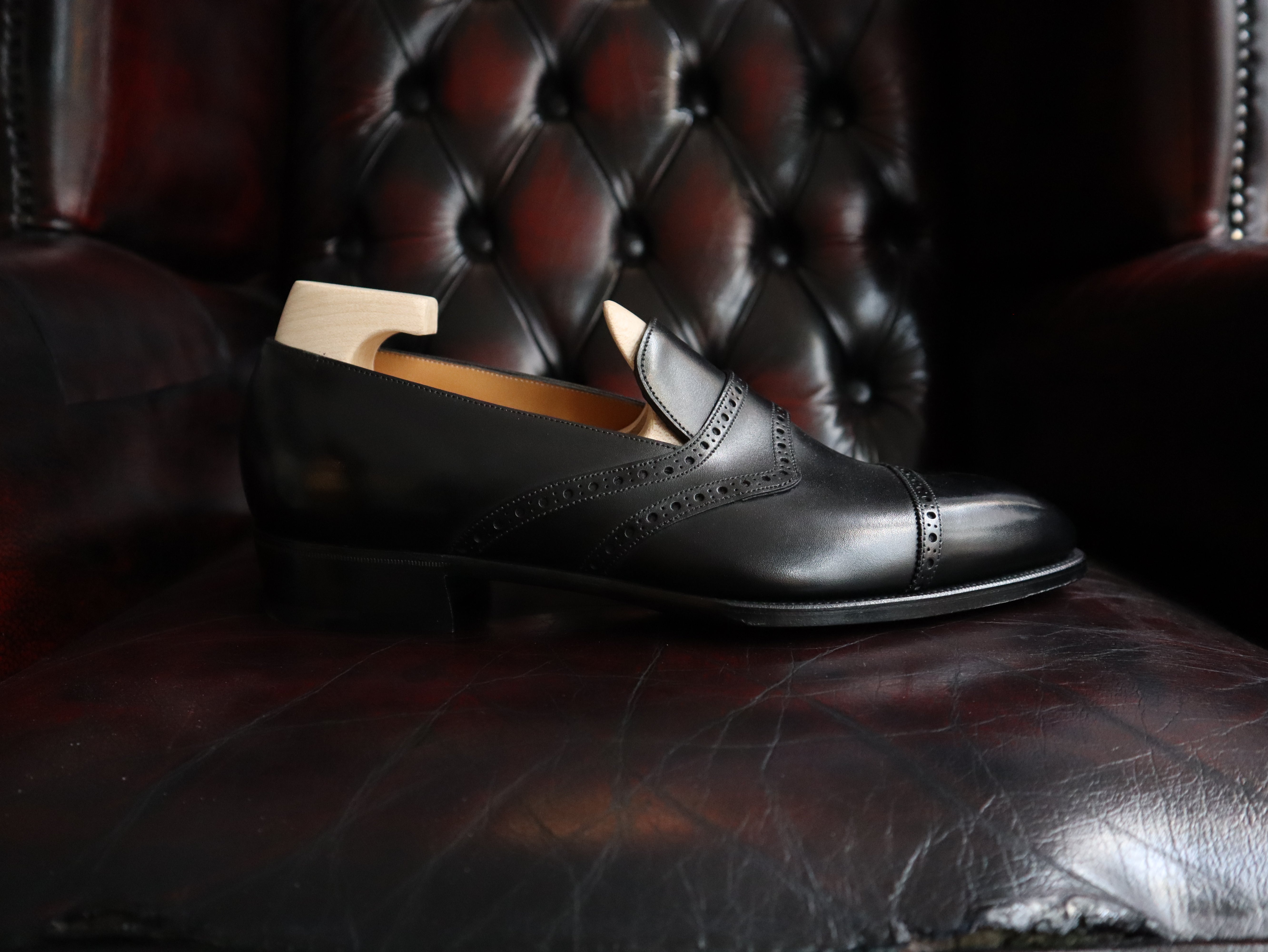 The full strap, cap-toe loafer with beautiful brogue detailing. Hand crafted from our black calf leather on our Soft Square Slip-On KN14 last.